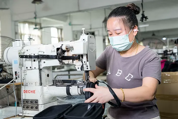 - Skilled craftsmen stitch the molded shells together with fabric edges, Reißverschlüsse, and reinforcement layers.