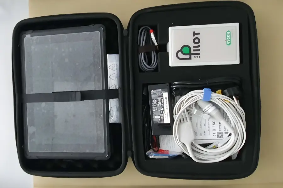 箱の内部には、さまざまなコンポーネントを保持するためにフォームインサートを取り付ける必要があります, ECGチップロケーションシステムを含む, ECGケーブル, 10インチのタブレットとその電源, USBキー, 取扱説明書, およびUSBアダプター.