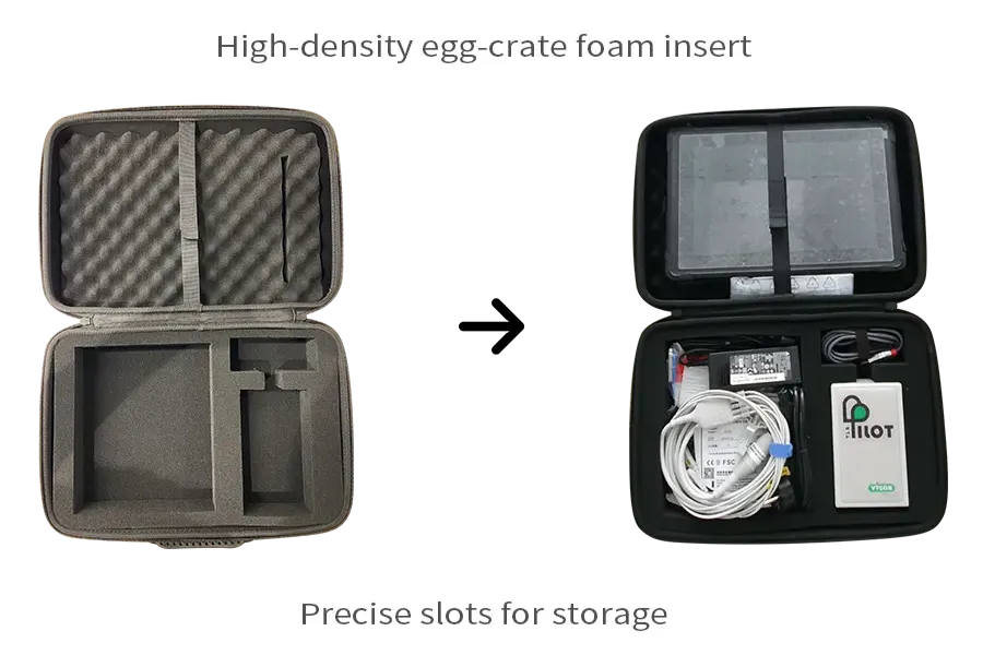 デバイスとアクセサリーにはさまざまなサイズと高さがあります, それに応じて、ボトムシェルのスロットは深く変化する必要があります. アイテムを効果的に緩和します, 刻まれたEVAフォームインサートを使用します, 優れた保護を提供するだけでなく、製品の美学も強化します. トップシェルについては, 私たちのエンジニアは、タブレットをしっかりと保持するために正確なスロットを作成しました, 最適な保護を確保しながら.
